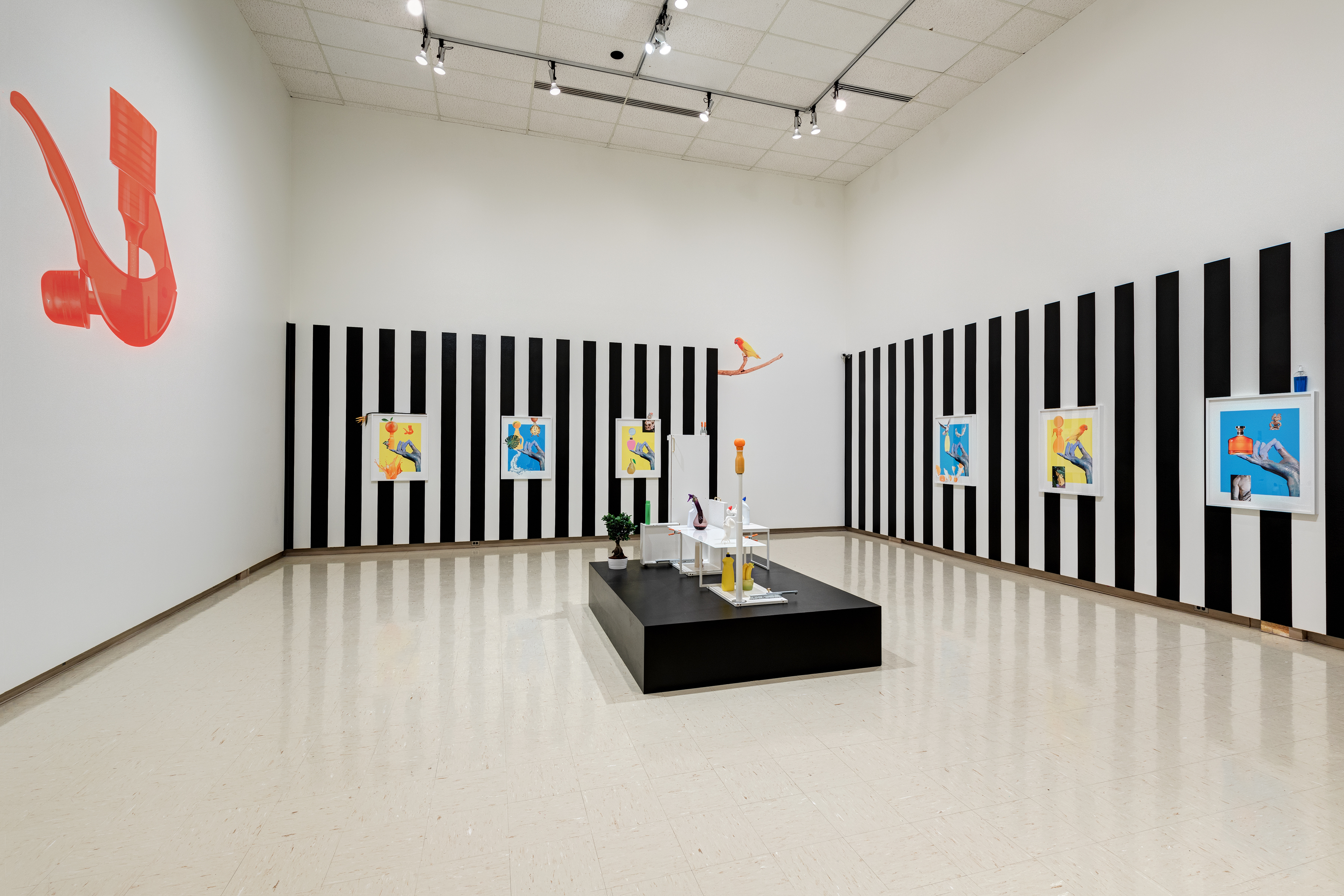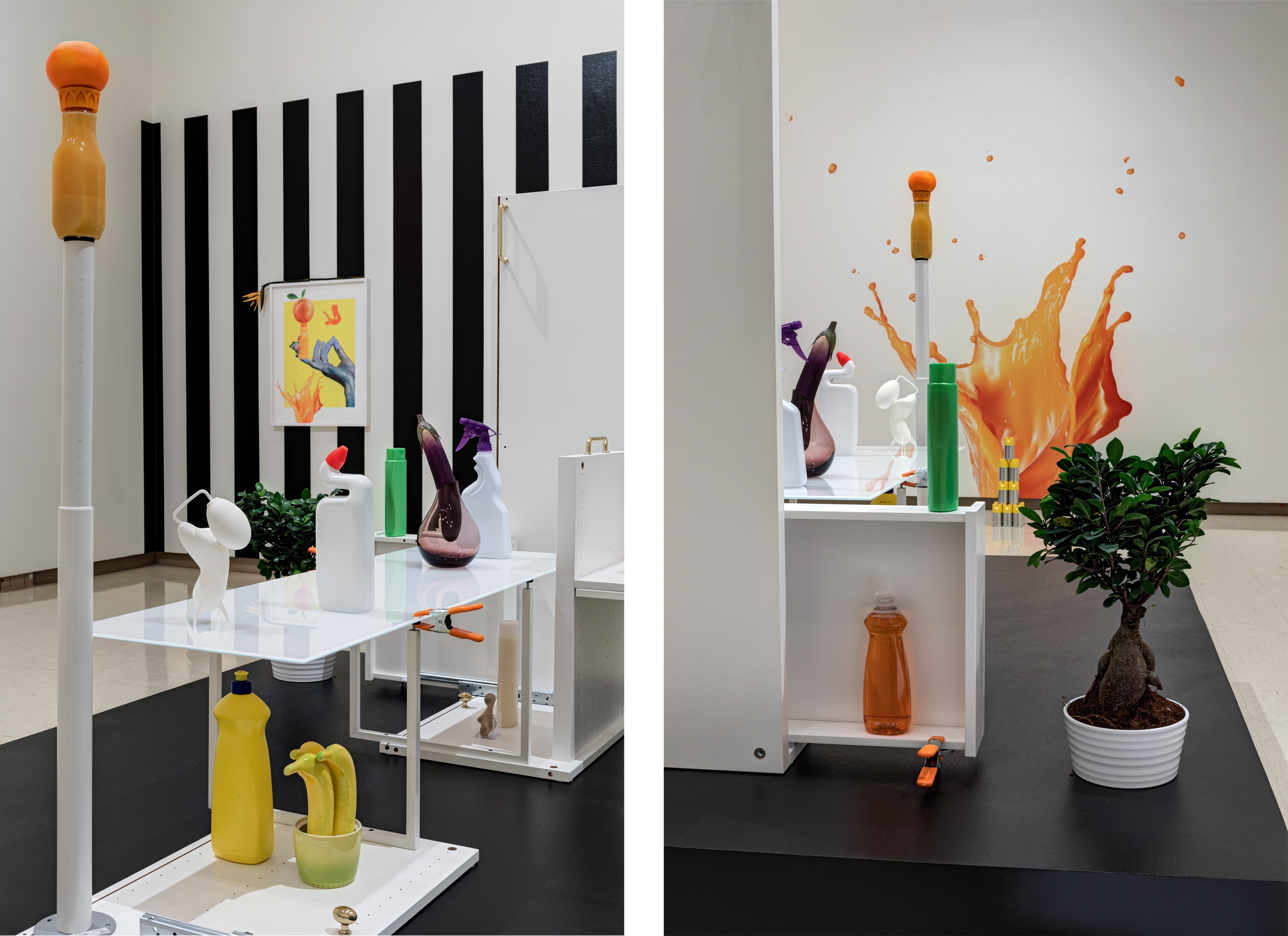 Stock photography, found objects and 3D models, IKEA BESTÅ furniture, spring clamps, Pre-Columbian objects, Bonsai tree, printed vinyl, paint.