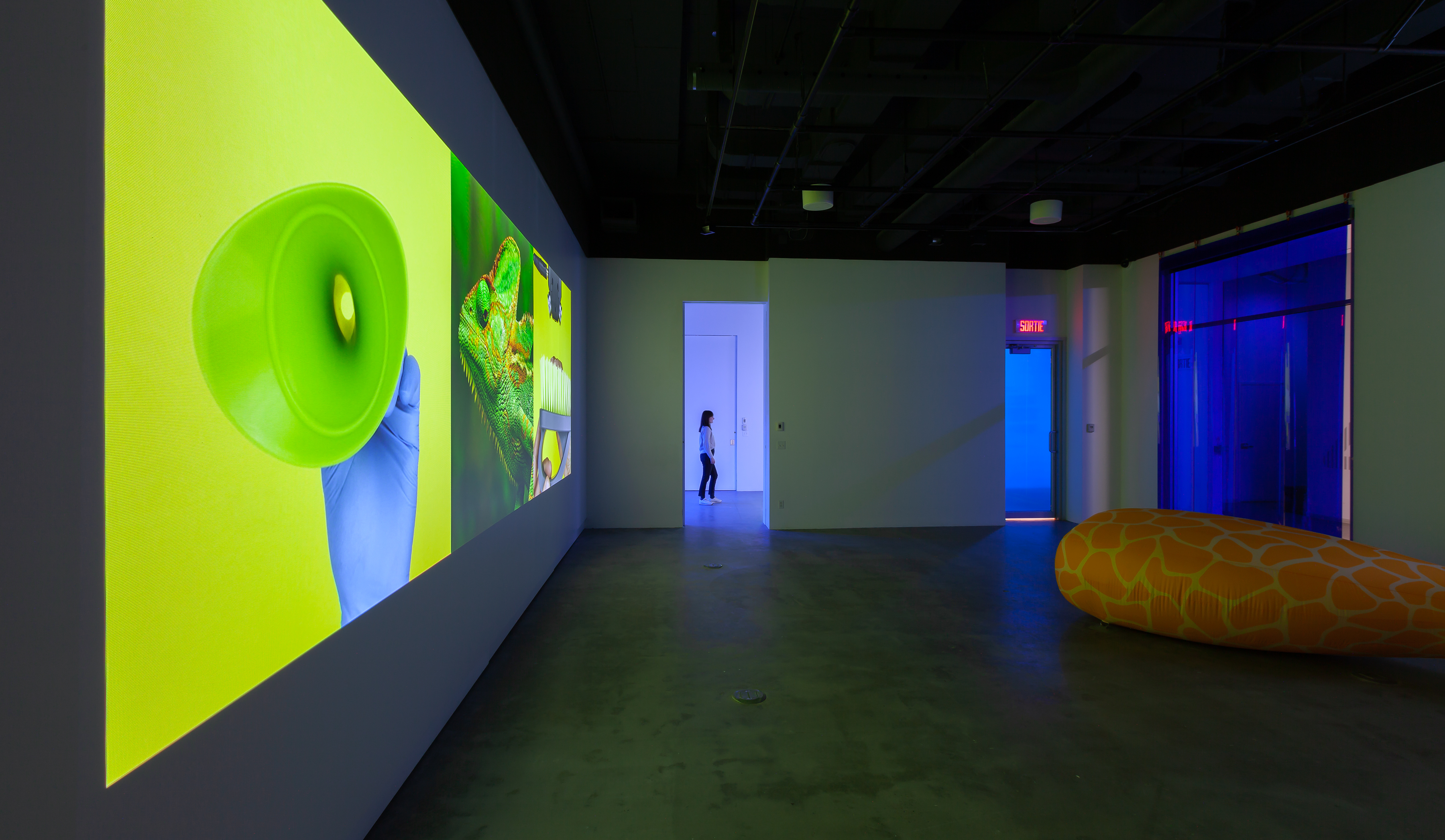 Video projection, pendant speakers, inflatable made with recycled nylon, video light with C-stand, lighting gels and spring clamps, 3D animation, inkjet prints on backlit film, lightboxes, found objects.